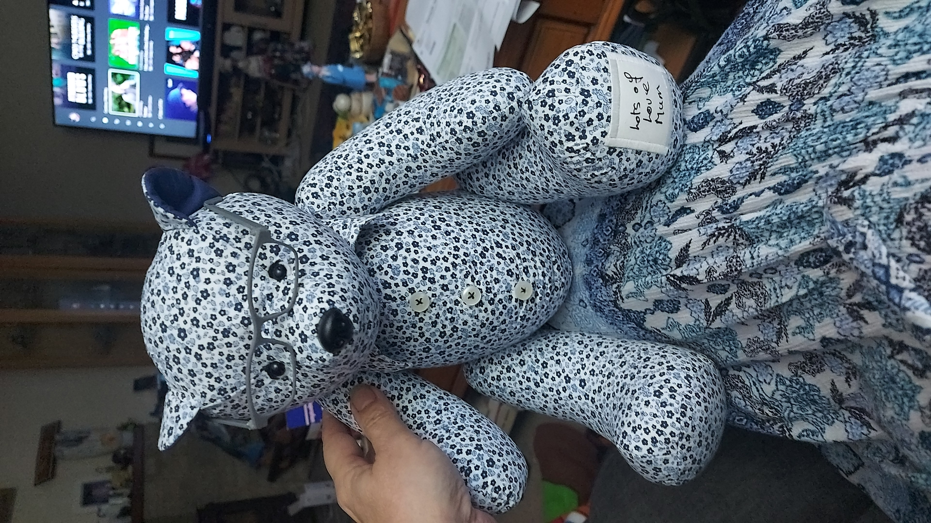 I just received my teddy bear today. It is a present for my mum. My granny passed away in October and Claire made a teddy bear with my granny s trousers and top! It is totally amazing the hard work and detail that she put into had me in tears today. Can t thank you enough my mum will be so happy xx