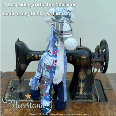 The giraffe needs one (or more, if you prefer) adult garment or five baby/child garments (based on 6-9 month sleepsuits). The giraffe measures approx. 37cm/14.5”.